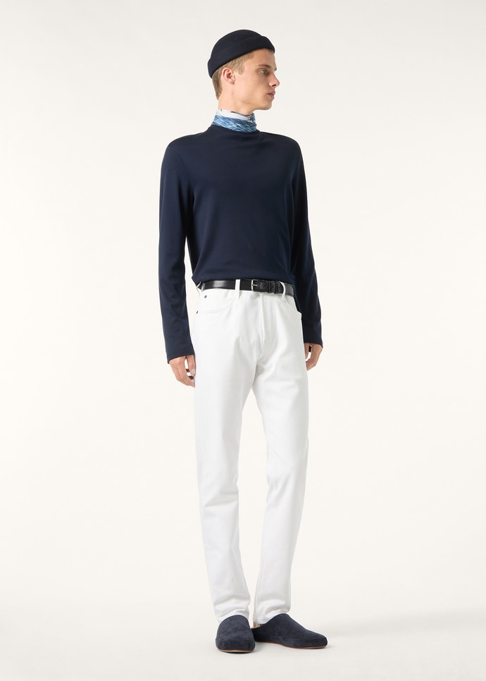 This product should be handled with care. We suggest never wearing the product two days in a row, so that the fibres regain their natural structure and texture. Check the label for washing and ironing instructions. We recommend washing by hand or using the hand wash cycle after four or five wears. Wash separately or with like colours using Loro Piana Cashmere Soap. Remove excess water by rolling it inside a towel and gently squeezing out any excess water. Air-dry flat between two soft towels away from direct sunlight. Steam iron to remove wrinkles and to reshape. Fold carefully and store with Loro Piana cedar balls/moth repellent in a dry place away from heat and light sources.