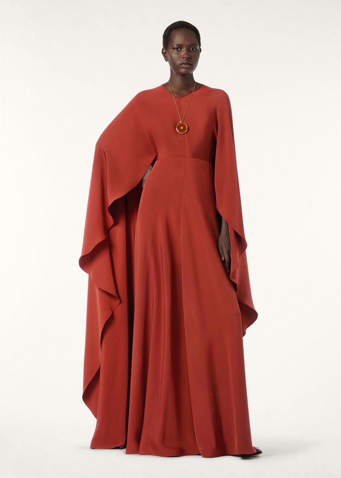 Casting an air of understated sophistication, the Bridget dress from the Ramadan Capsule is cut from silk cady to a floor-grazing silhouette. The pure silk fabric is structured yet flows effortlessly from the waist to a voluminous cape and swaying hem. A closer look reveals the subtle V-neckline is traced with satin piping.