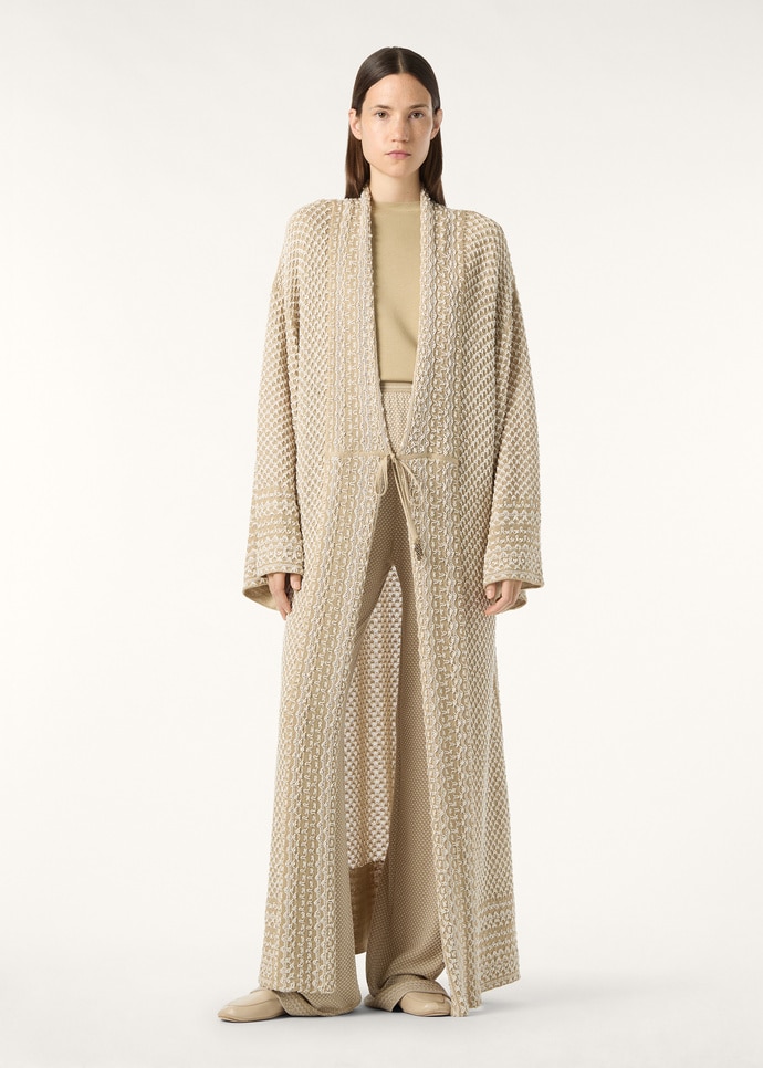 Relaxed yet intricately detailed, the Palm robe is a refined layer from the Ramadan Capsule. Its elegant silk base is skilfully interwoven with delicate motifs in linen, silk, and cashmere yarns to reveal subtle depth and artistry. The side slits are cut generously to allow for effortless movement.
